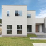 分譲地の一画に佇む、ホワイト×グレーの優しい風合いの外観が印象的な邸宅。