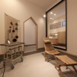 梁の一部には間接照明を取付け、空間に奥行きを持たせて実際よりも広く感じさせる工夫がなされています。