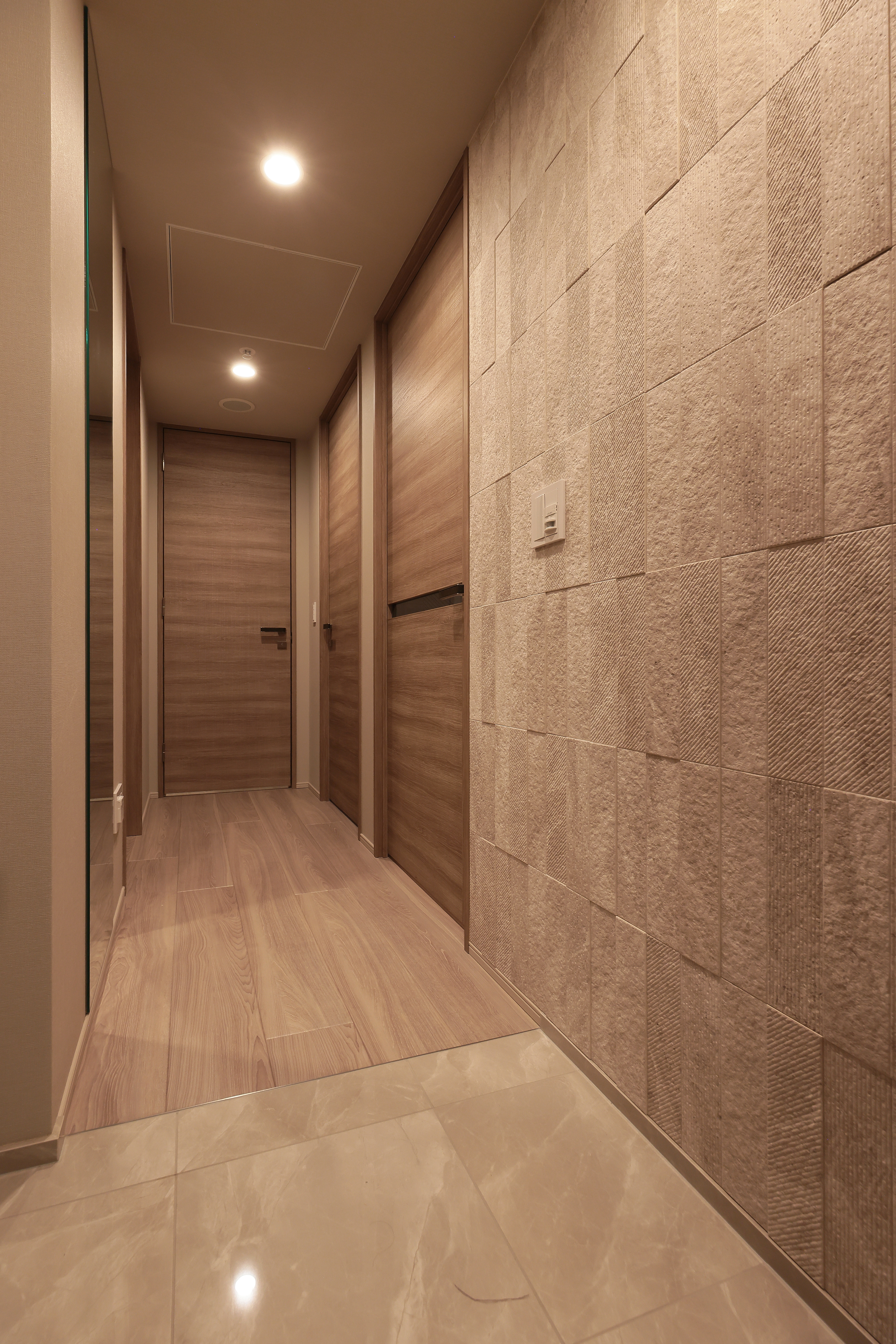 元々はシンプルなクロスのみでしたが、入った瞬間特別感を感じる印象的な玄関となりホテルライクな空間に