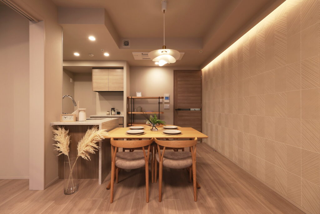 間接照明もプラスし、柔らかな光がタイルの陰影を上品に照らしています。