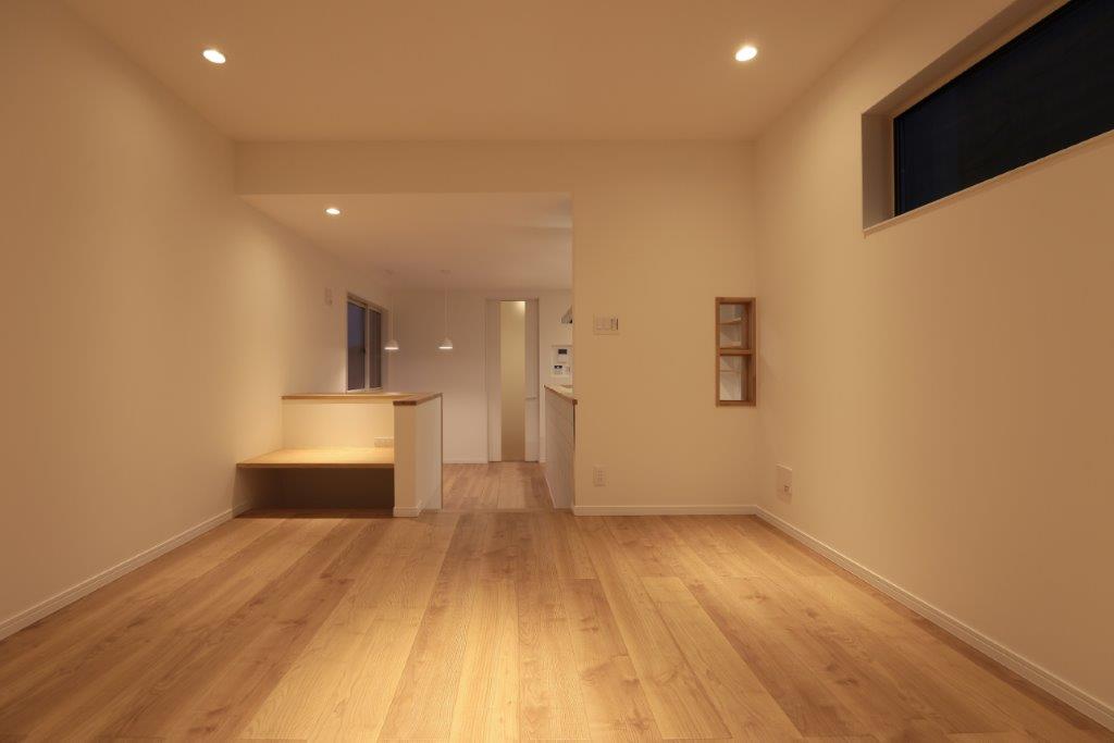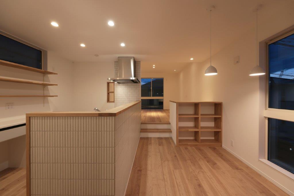 一段高くしたリビングスペースが、空間に奥行と変化を与えています。
