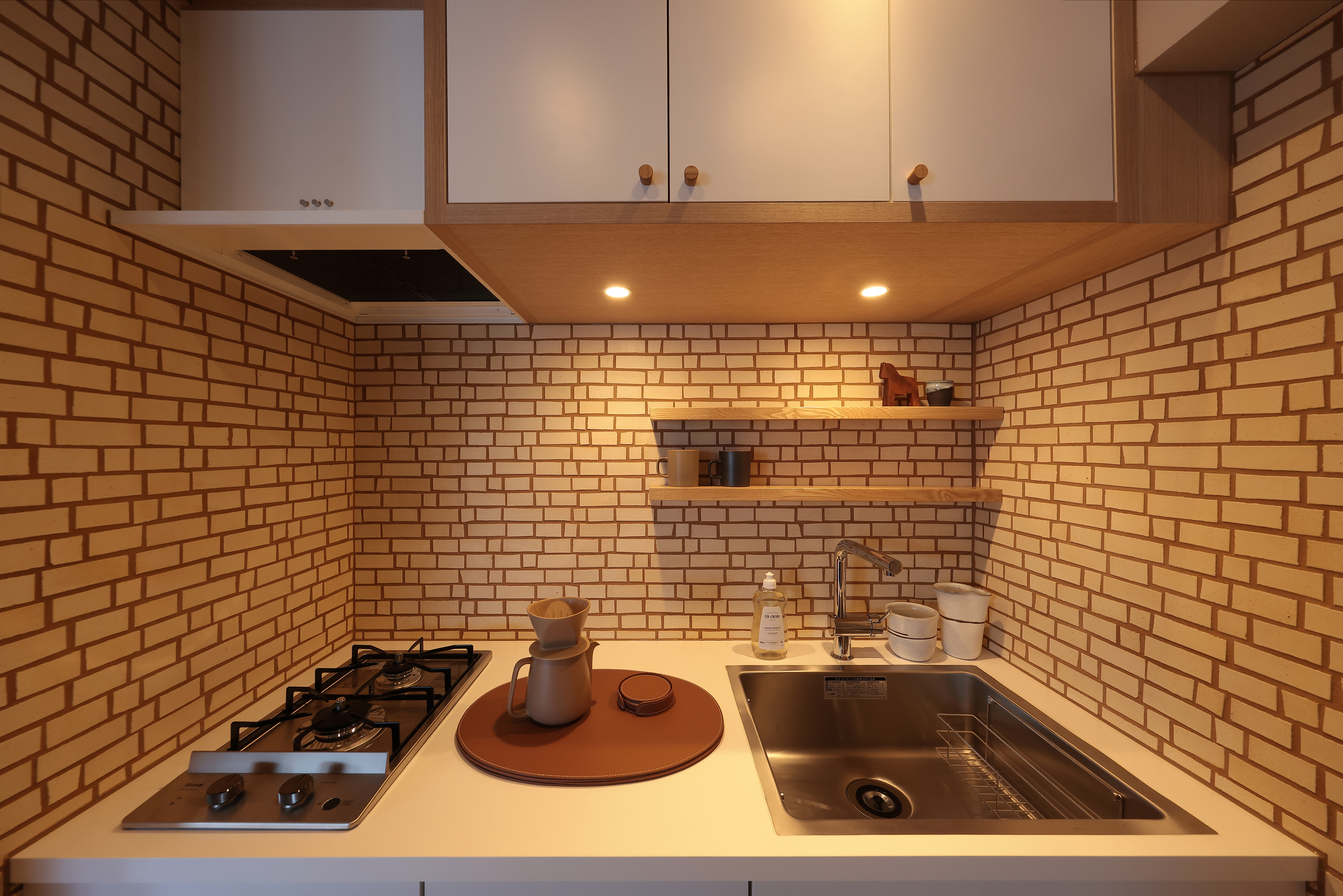アクセントで平田タイルの【Casares/CASR-W】をキッチンタイルとして採用