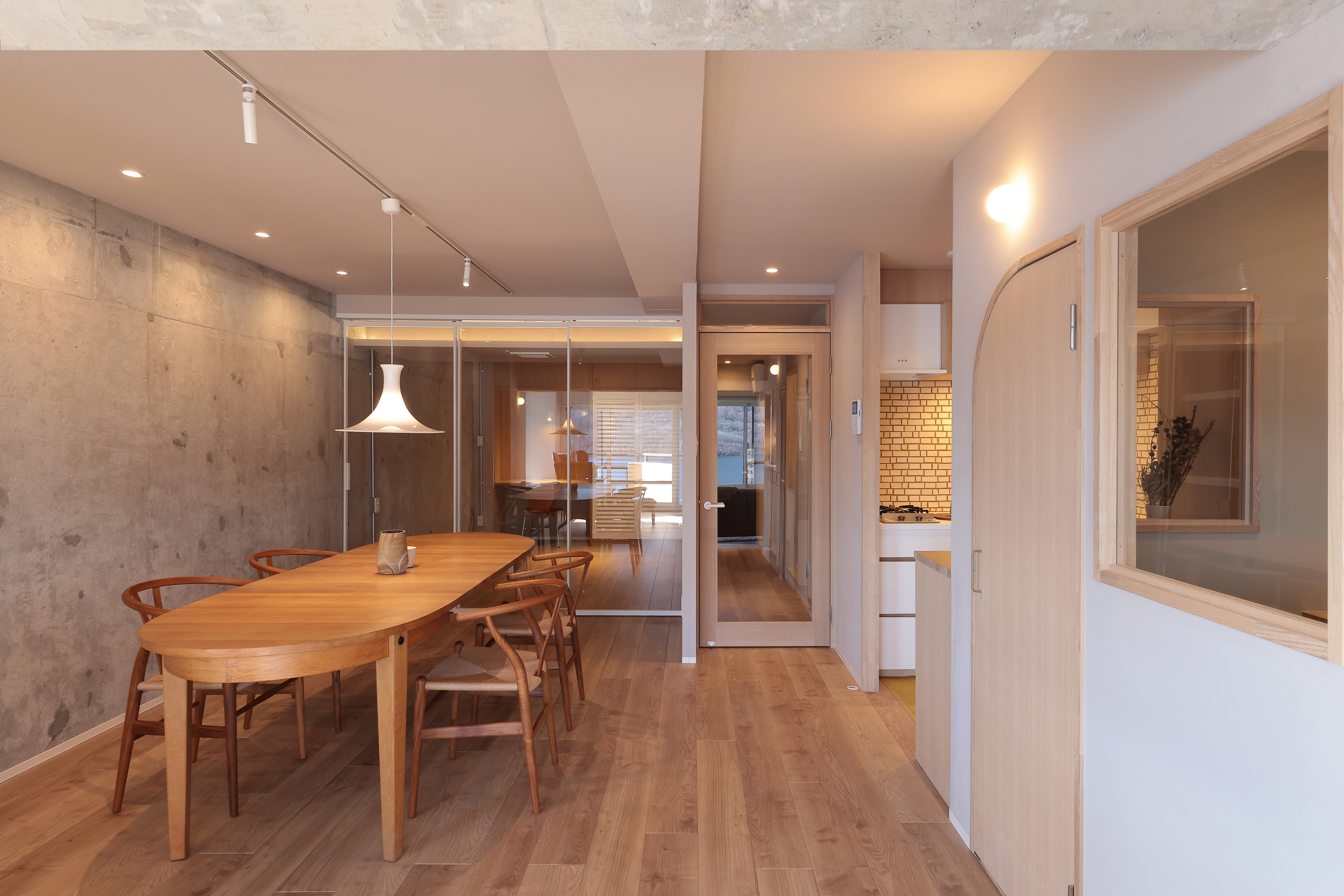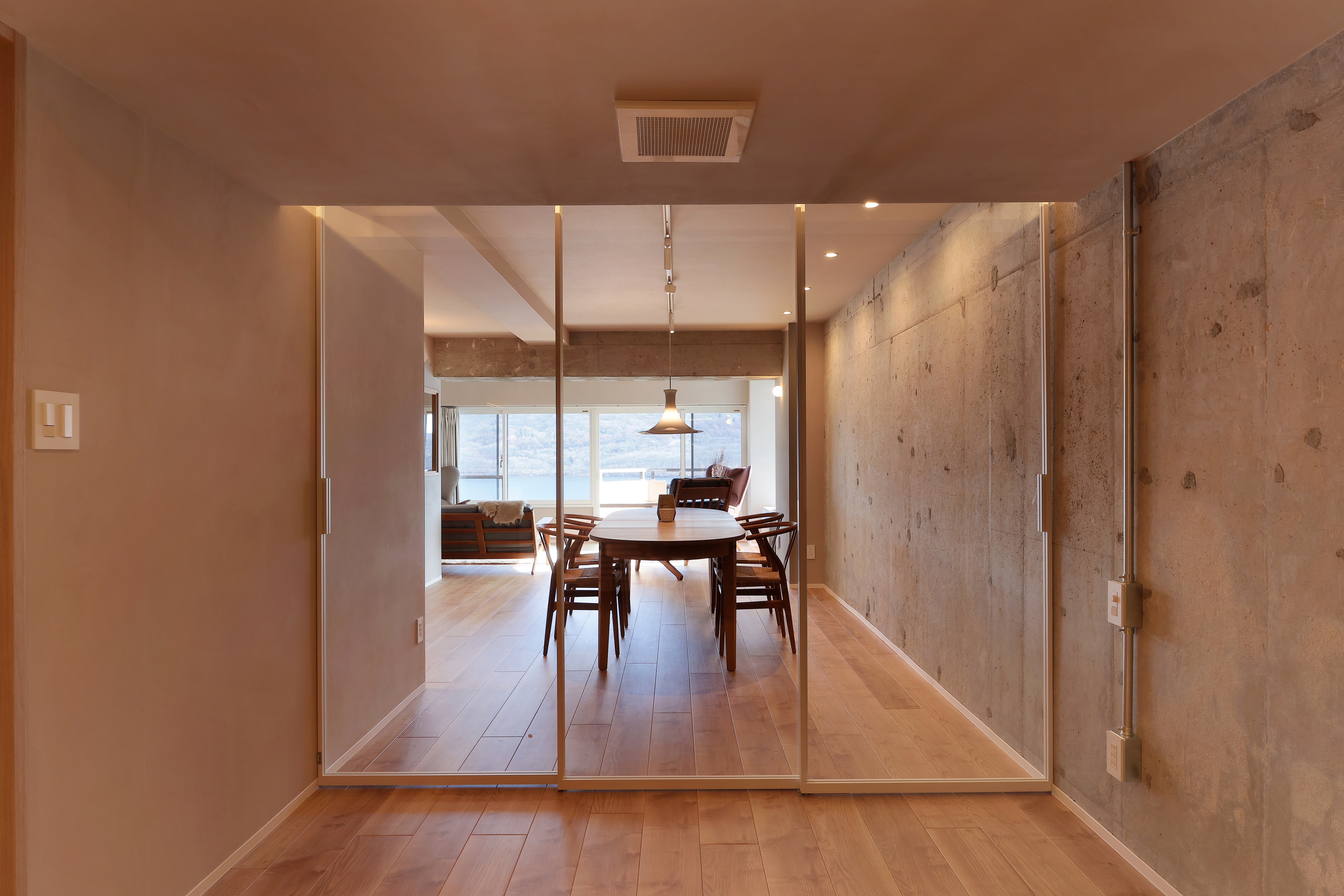 LDKまで繋がる現わし仕上げの躯体とその先に広がる景色で空間に奥行きが出ました。