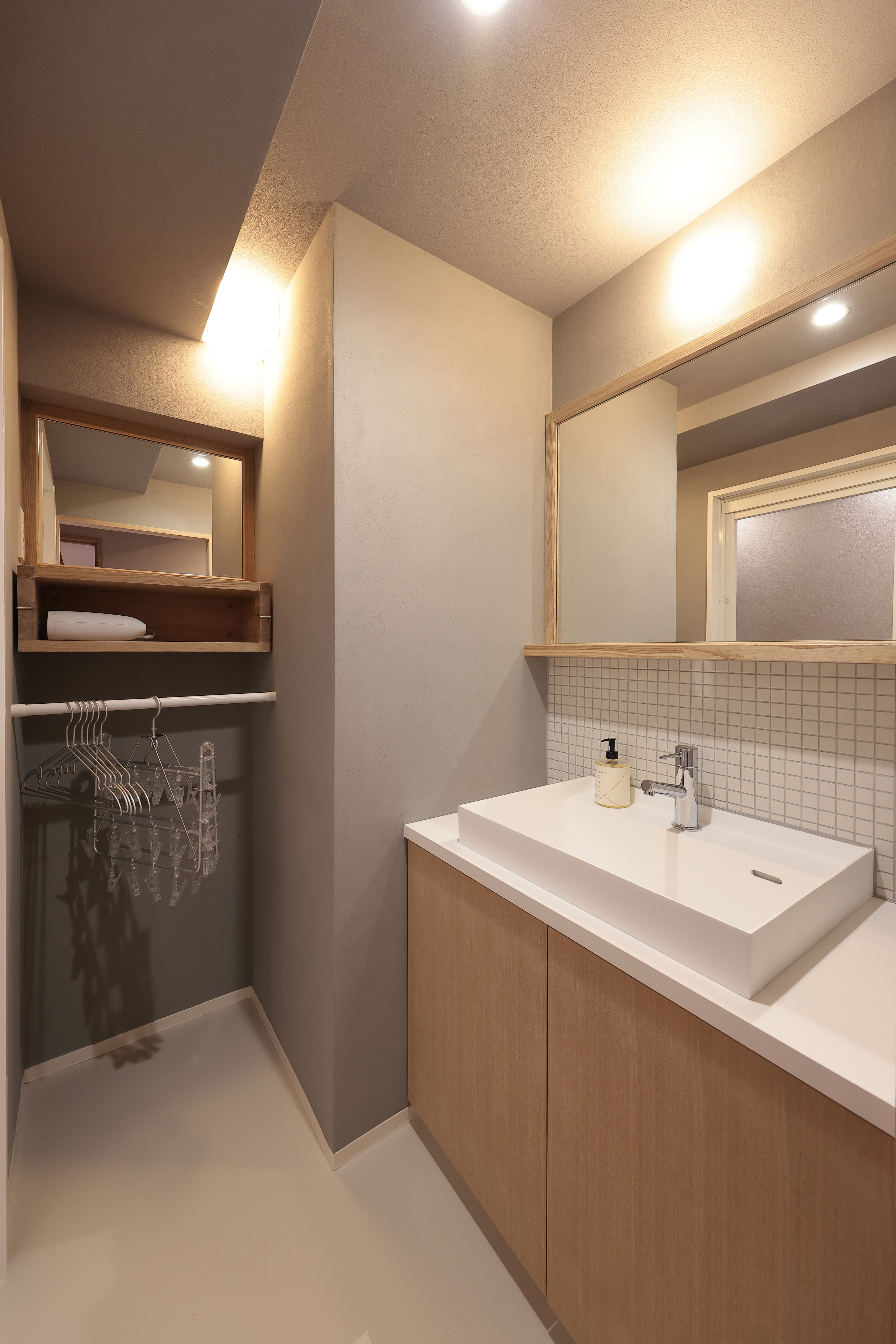 洗面脱衣室には造作の洗面台と折り畳みの収納を設置