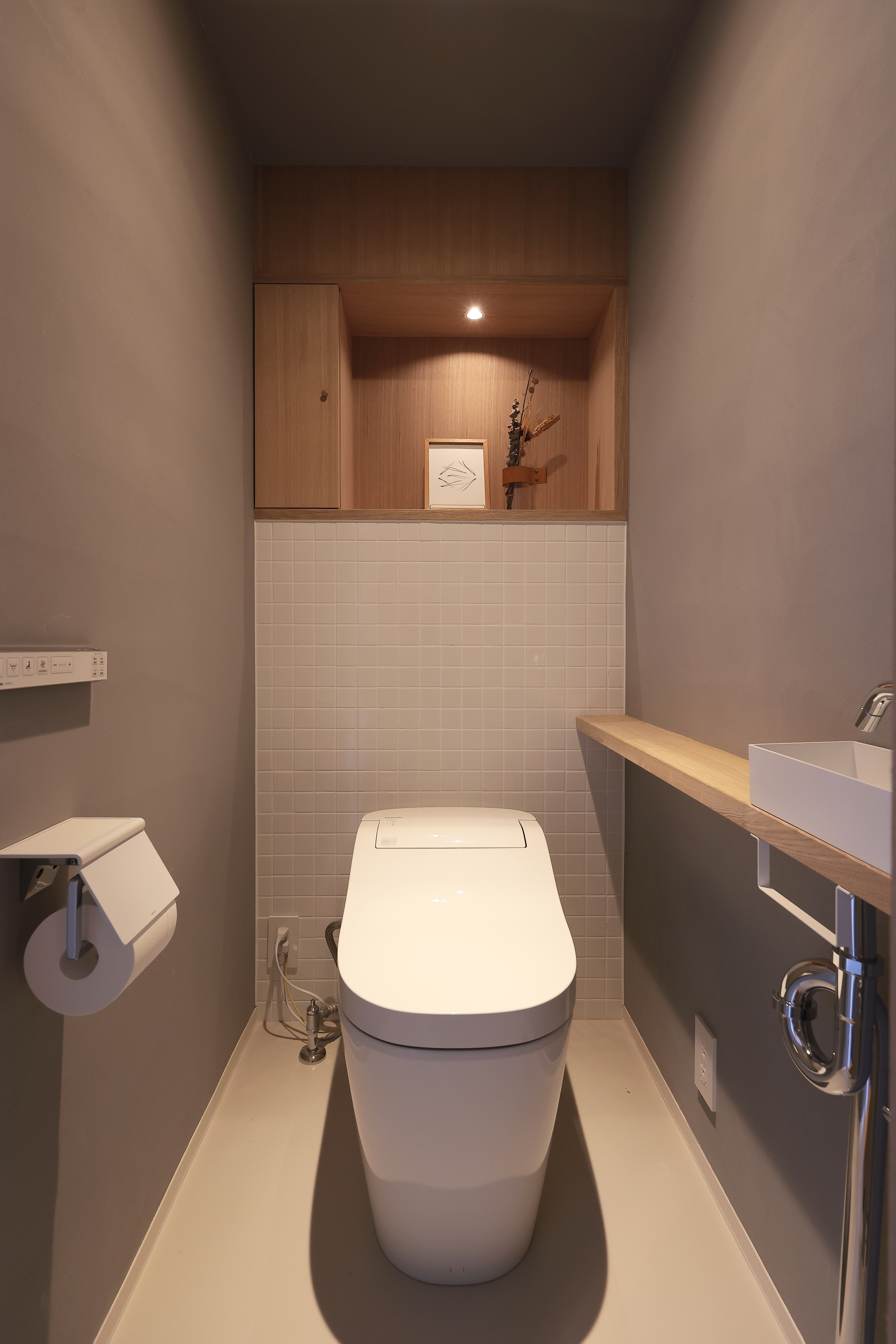 小型のダウンライトがタイルを優しく照らし、トイレであってもメインの部屋の雰囲気にも負けない空間づくりを意識しました。